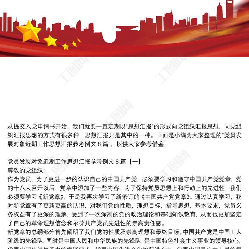 工圖網(wǎng)提供黨員發(fā)展對象近期工作思想?yún)R報(bào)參考例文8篇供會員免費(fèi)下載。更多精彩黨課PPT素材,盡在工圖網(wǎng)。