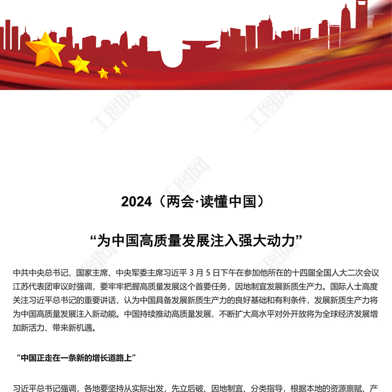 工圖網提供2024兩會讀懂中國PPT精美創(chuàng)意為中國高質量發(fā)展注入強大動力黨課課件(講稿)供會員免費下載。更多精彩黨課PPT素材,盡在工圖網。