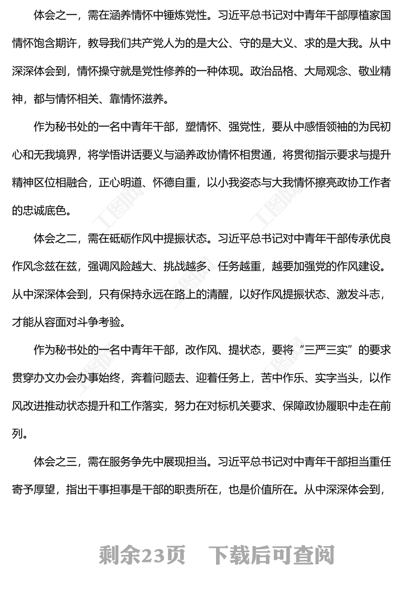 2021年輕干部警示教育發(fā)言材料2021青年干部青春心向黨奮進新征程演講稿2022青年干部能力作風建設(shè)暨墩苗育苗計劃交流座談會發(fā)言匯編2021校長在組織生活會上的發(fā)言材料2021副市長在政協(xié)提案現(xiàn)場辦理座談會上的講話2021青年干部座談會上的交流發(fā)言2022年輕干部警示教育發(fā)言材料觸目驚心2022兩個確立主題黨課講稿及研討發(fā)言材料10篇匯編2023堅持人民至上研討發(fā)言材料2023新時代中國特色社會主義思想研討會上的發(fā)言材料2023堅持人民至上主題發(fā)言材料2023堅持人民至上專題發(fā)言材料2023青年干部提升干事創(chuàng)業(yè)能力2023青年干部提升干事能力報告2023青年干部 拒絕躺平 座談會發(fā)言