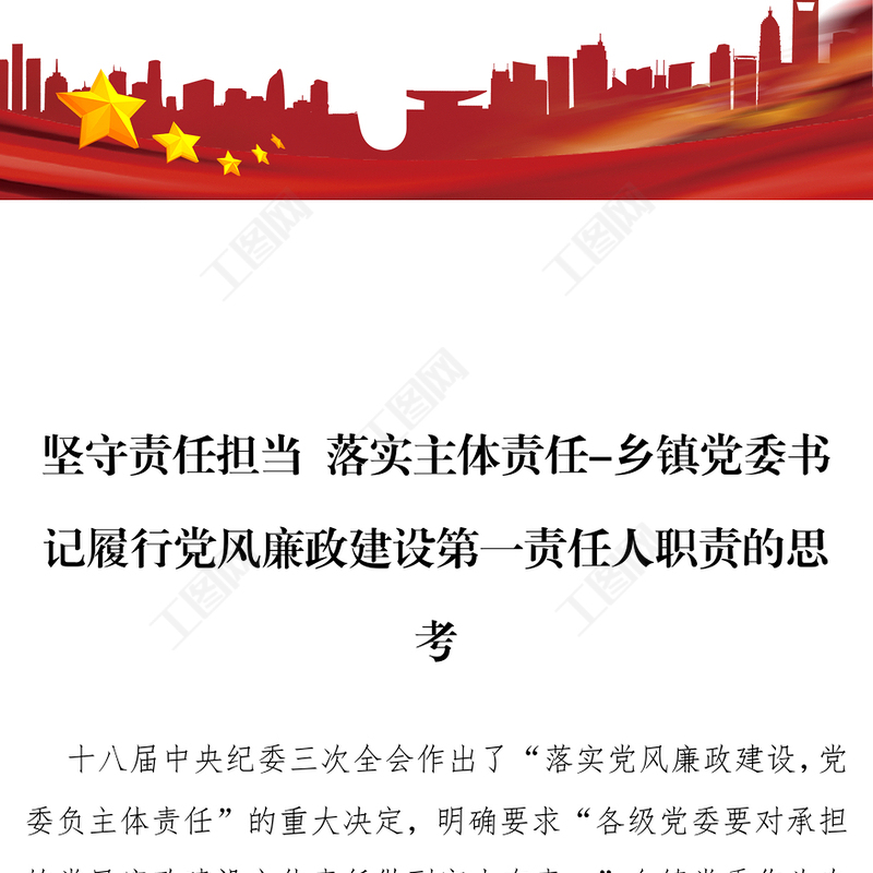 工圖網(wǎng)提供堅(jiān)守責(zé)任擔(dān)當(dāng)落實(shí)主體責(zé)任-鄉(xiāng)鎮(zhèn)黨委書(shū)記履行黨風(fēng)廉政建設(shè)第一責(zé)任人職責(zé)的思考供會(huì)員免費(fèi)下載。更多精彩黨課PPT素材,盡在工圖網(wǎng)。