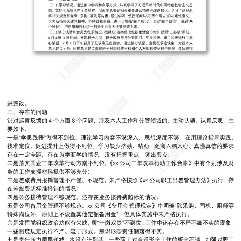 工圖網(wǎng)提供國(guó)企落實(shí)上級(jí)黨委巡察整改專題組織生活會(huì)對(duì)照檢查材料供會(huì)員免費(fèi)下載。更多精彩黨課PPT素材,盡在工圖網(wǎng)。