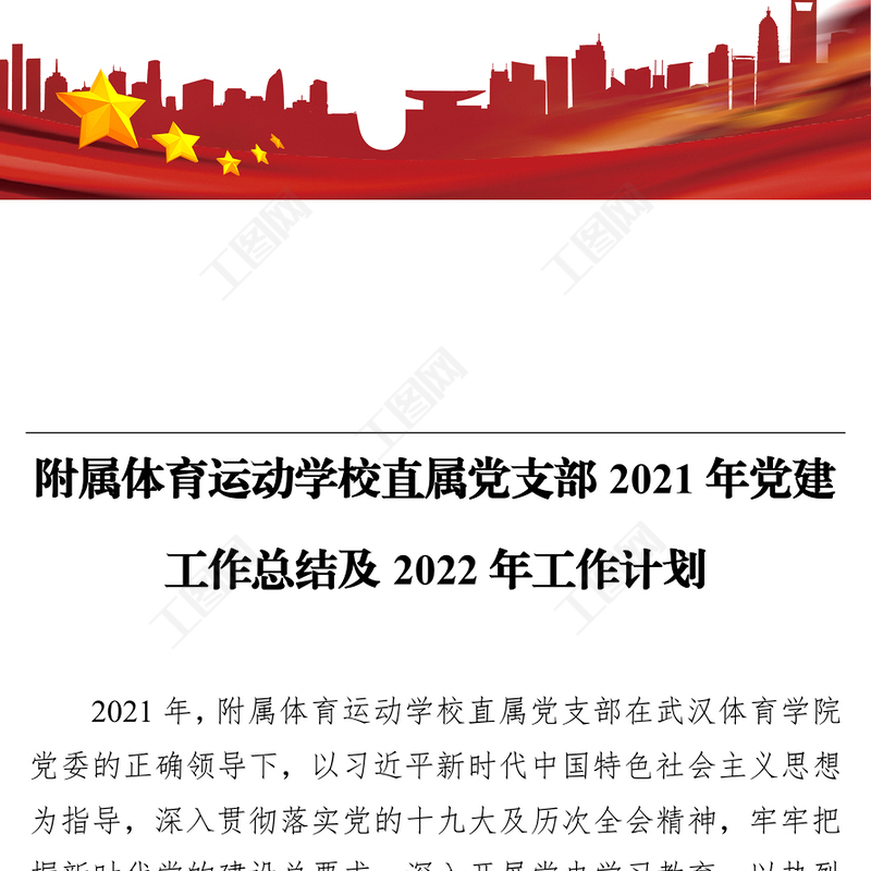 工圖網(wǎng)提供附屬體育運(yùn)動(dòng)學(xué)校直屬黨支部2021年黨建工作總結(jié)及2022年工作計(jì)劃供會(huì)員免費(fèi)下載。更多精彩黨課PPT素材,盡在工圖網(wǎng)。