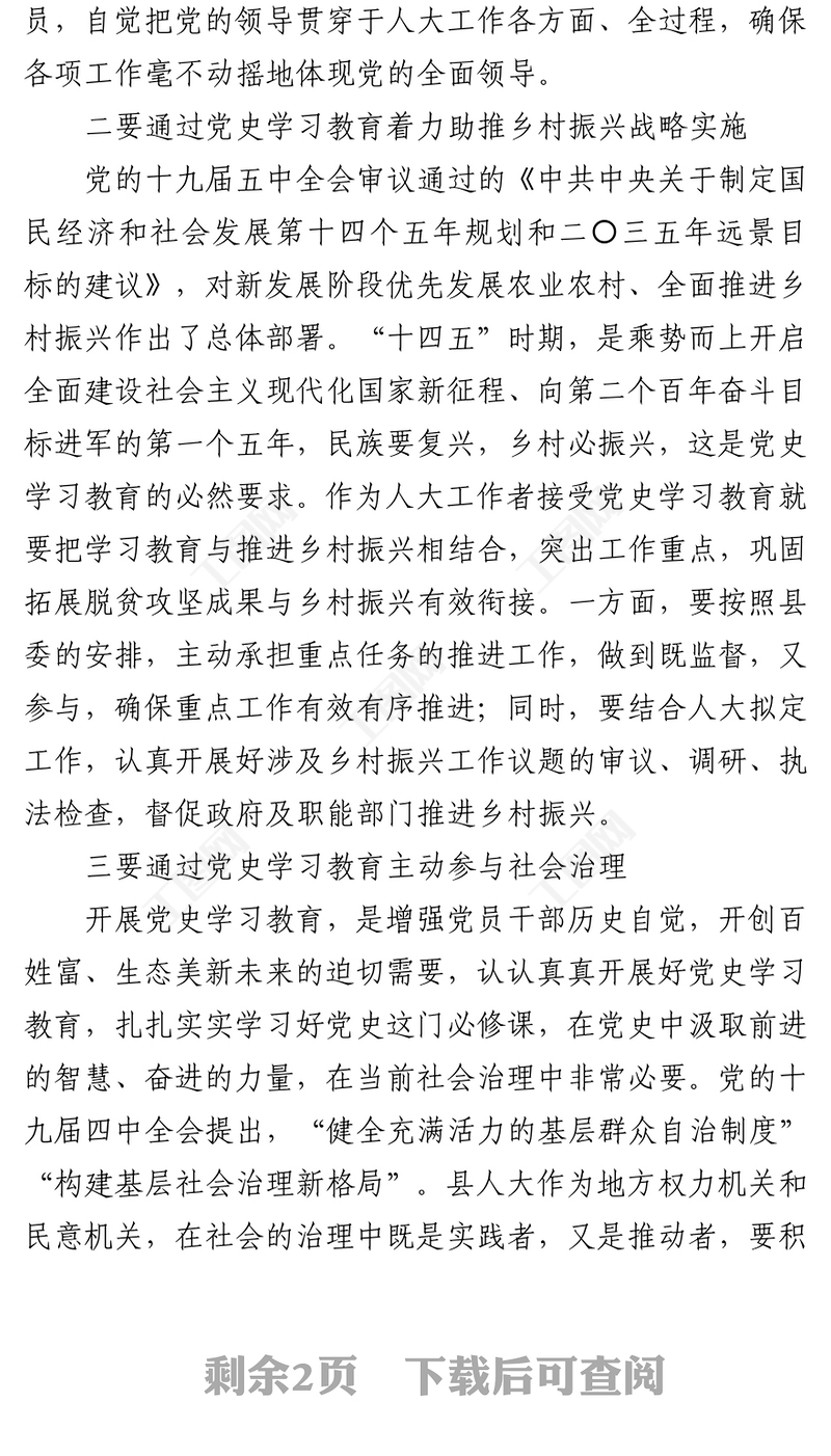 黨史學(xué)習(xí)教育讀書班研討交流材料(人大)加強黨史學(xué)習(xí)教育強化人大責(zé)任擔(dān)當(dāng)下載