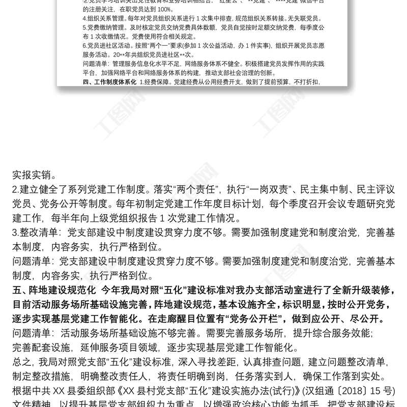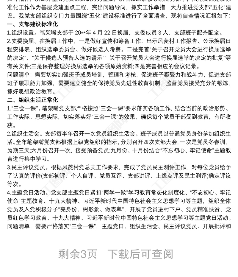 黨支部“五化”建設(shè)自查情況報告(五化建設(shè)總結(jié)匯報報告,支部工作總結(jié))包含