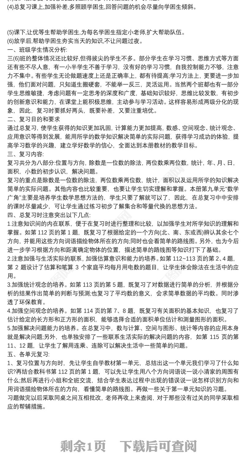 三年級數(shù)學上冊復(fù)習計劃 Array