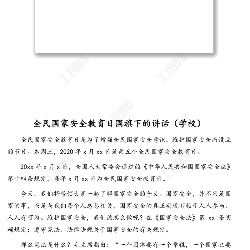 工圖網(wǎng)提供全民國家安全教育日講話(3篇)供會員免費下載。更多精彩黨課PPT素材,盡在工圖網(wǎng)。