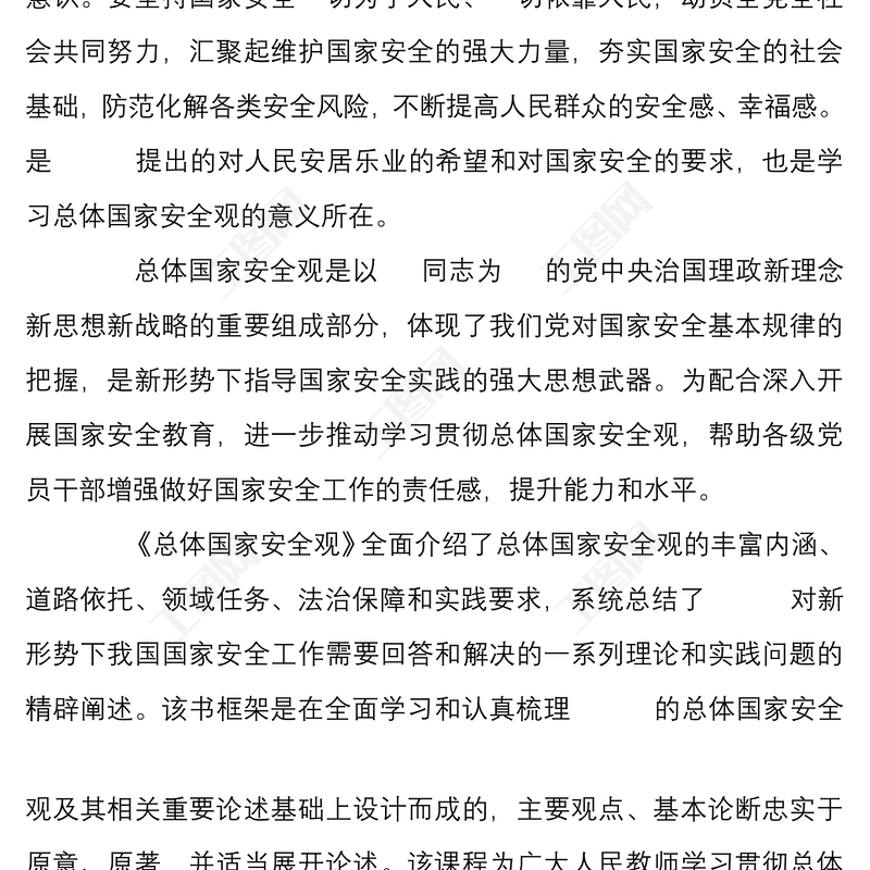 工圖網(wǎng)提供5篇學(xué)習(xí)堅(jiān)持總體國(guó)家安全觀心得體會(huì)文稿匯編供會(huì)員免費(fèi)下載。更多精彩黨課PPT素材,盡在工圖網(wǎng)。