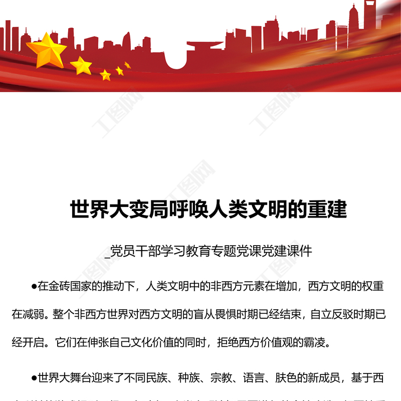 工圖網(wǎng)提供2022世界大變局呼喚人類文明的重建PPT大氣黨建風(fēng)黨員干部學(xué)習(xí)教育專題黨課黨建課件(講稿)供會(huì)員免費(fèi)下載。更多精彩黨課PPT素材,盡在工圖網(wǎng)。