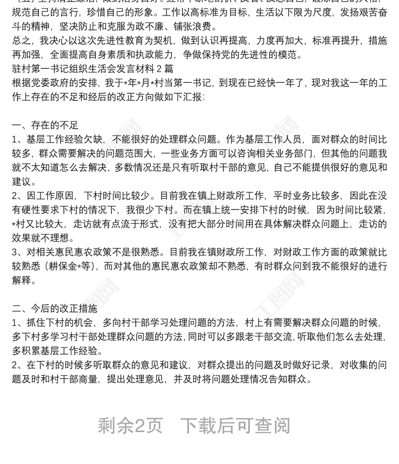 工圖網(wǎng)提供駐村第一書記組織生活會(huì)發(fā)言材料3篇供會(huì)員免費(fèi)下載。更多精彩黨課PPT素材,盡在工圖網(wǎng)。
