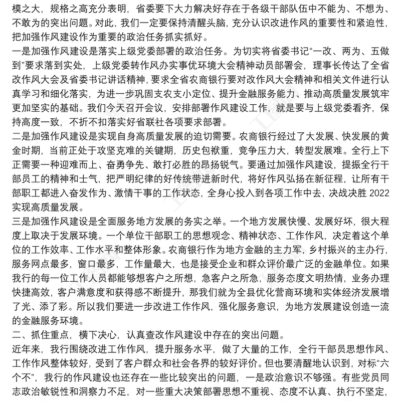 在銀行改進工作作風加強作風建設動員部署會議上的講話材料包含