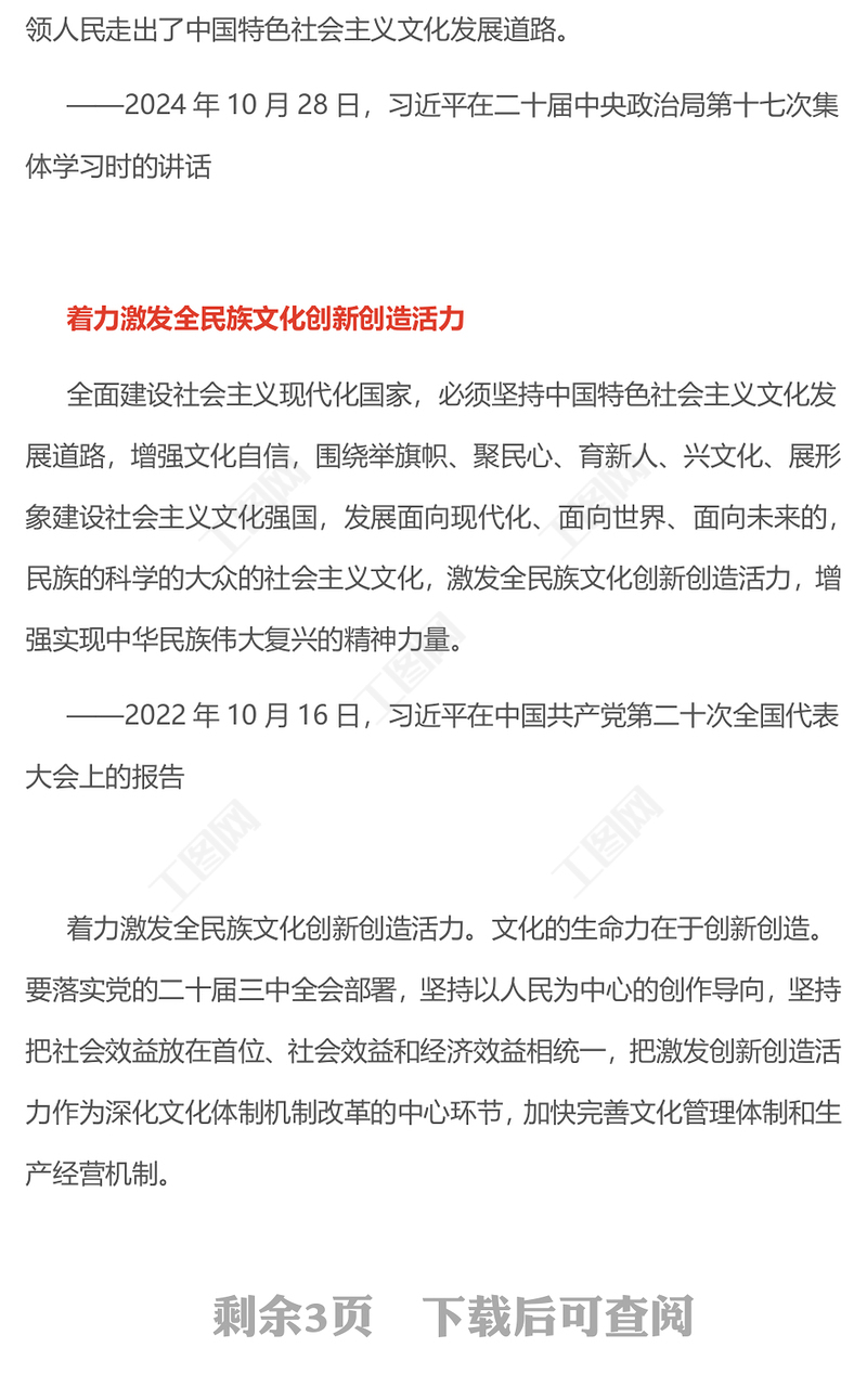 工圖網(wǎng)提供堅定不移走中國特色社會主義文化發(fā)展道路PPT總書記重要論述學習課件(講稿)供會員免費下載。更多精彩黨課PPT素材,盡在工圖網(wǎng)。