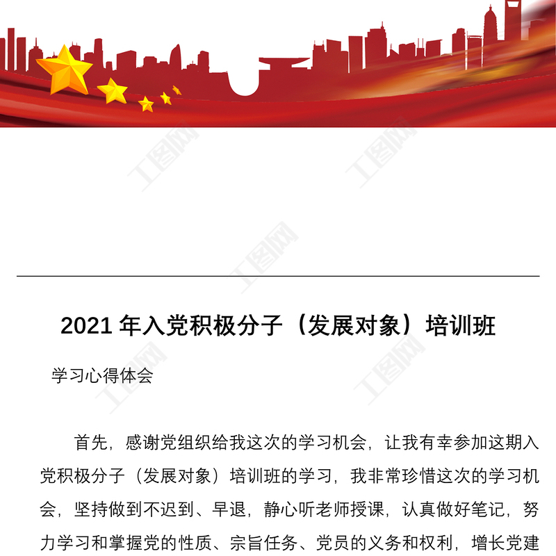 工圖網(wǎng)提供【原創(chuàng)】2021年入黨積極分子(發(fā)展對象)培訓(xùn)班學(xué)習(xí)心得體會供會員免費下載。更多精彩黨課PPT素材,盡在工圖網(wǎng)。