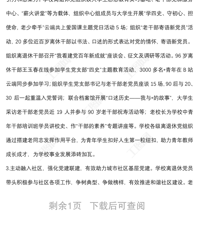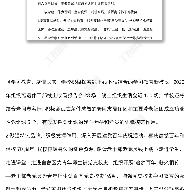 > 公文范文 > 黨建引領(lǐng) 整合資源 創(chuàng)新實(shí)踐 發(fā)揮作用——大學(xué)離退休工作部門交流發(fā)言材料.DOCX 【圖片、文字、動(dòng)畫均可編輯】