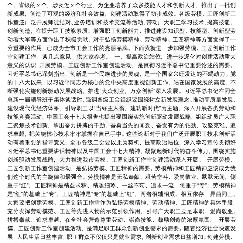 在20**年勞模創(chuàng)新工作室創(chuàng)建工作經(jīng)驗(yàn)交流會上的講話