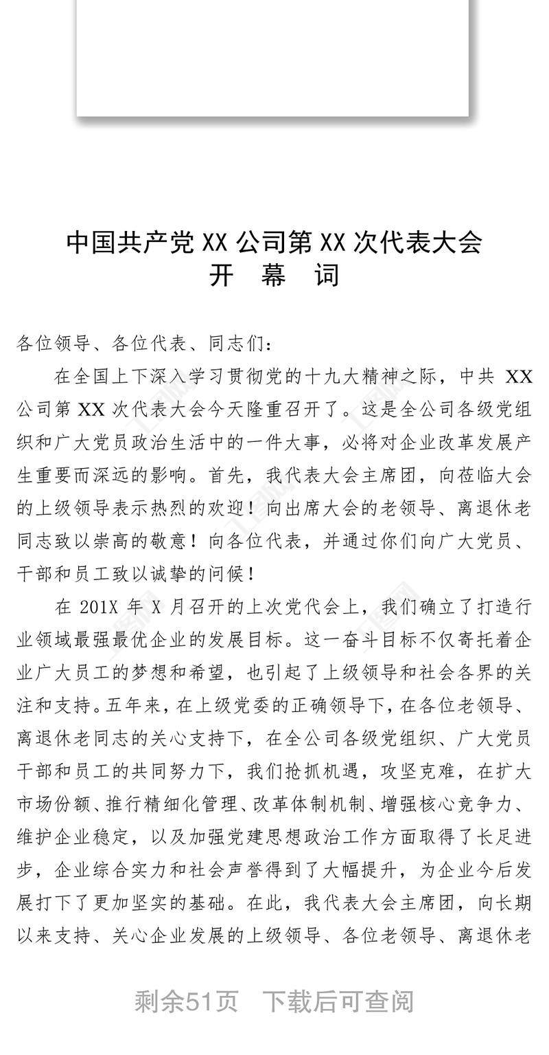 中國(guó)共產(chǎn)黨XX公司第XX次代表大會(huì)開幕詞