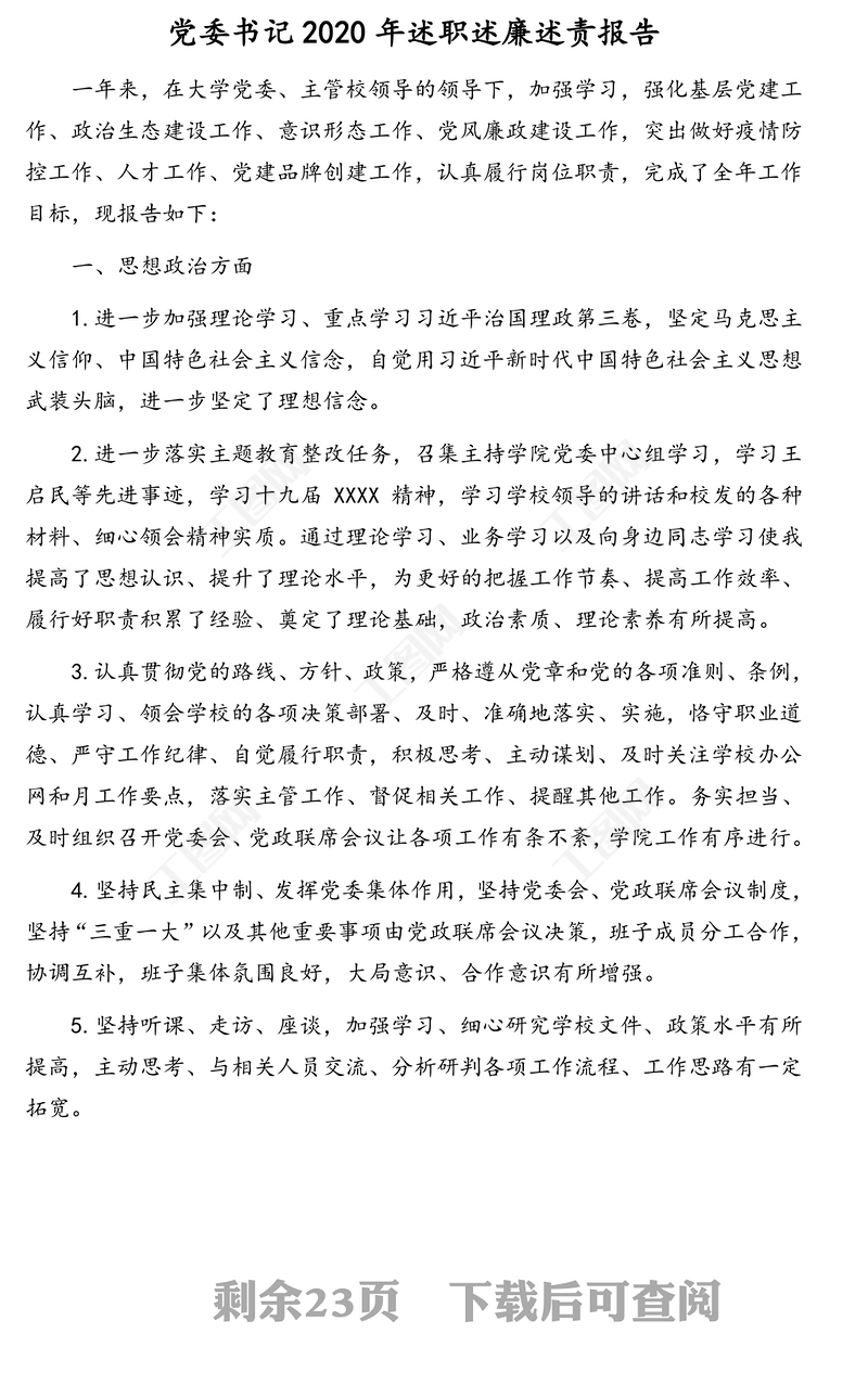 工圖網(wǎng)提供黨委書(shū)記、院長(zhǎng)、紀(jì)檢委書(shū)記、工會(huì)主席及副院長(zhǎng)2020年述職述廉述責(zé)報(bào)告匯編(6篇)(高校)供會(huì)員免費(fèi)下載。更多精彩黨課PPT素材,盡在工圖網(wǎng)。