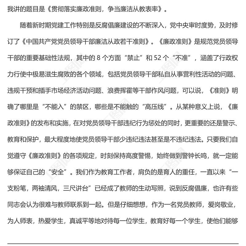 工圖網(wǎng)提供教師黨風(fēng)廉政專題黨課講稿:貫徹落實(shí)廉政準(zhǔn)則 爭(zhēng)當(dāng)廉潔從教表率供會(huì)員免費(fèi)下載。更多精彩黨課PPT素材,盡在工圖網(wǎng)。
