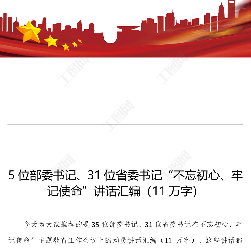工圖網(wǎng)提供動(dòng)員會(huì)發(fā)言稿31位省委書記“不忘初心牢記使命”動(dòng)員講話供會(huì)員免費(fèi)下載。更多精彩黨課PPT素材,盡在工圖網(wǎng)。