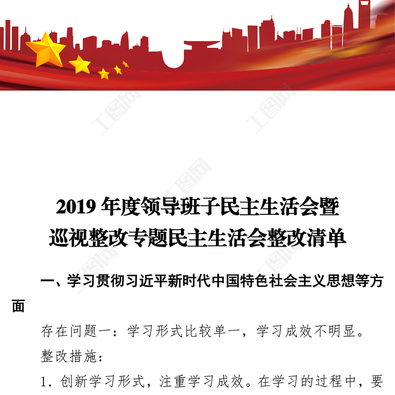 工圖網(wǎng)提供2019年度領(lǐng)導(dǎo)班子民主生活會暨巡視整改專題民主生活會整改清單供會員免費(fèi)下載。更多精彩黨課PPT素材,盡在工圖網(wǎng)。