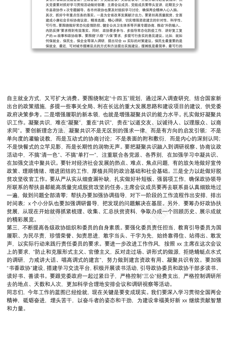 政協(xié)主席在傳達(dá)學(xué)習(xí)兩會精神大會上的講話