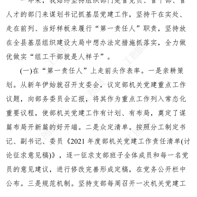 工圖網(wǎng)提供組織部機(jī)關(guān)黨支部書記2021年度抓基層黨建工作述職報(bào)告供會(huì)員免費(fèi)下載。更多精彩黨課PPT素材,盡在工圖網(wǎng)。