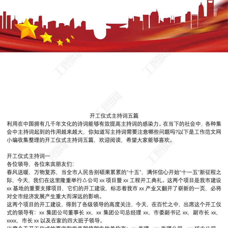 工圖網(wǎng)提供開(kāi)工儀式主持詞【5篇】供會(huì)員免費(fèi)下載。更多精彩黨課PPT素材,盡在工圖網(wǎng)。