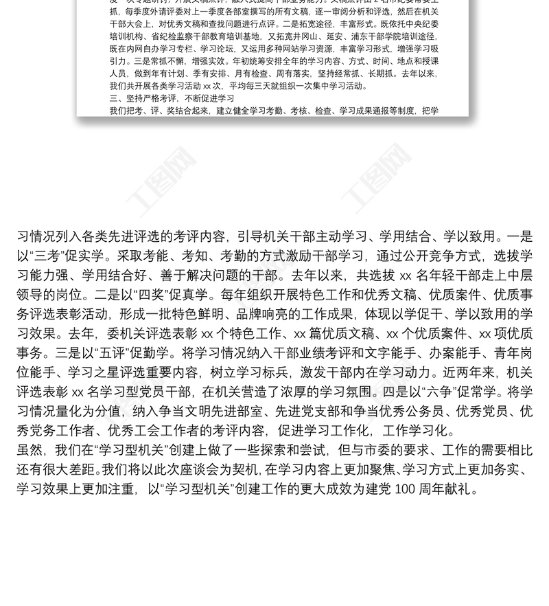 工圖網(wǎng)提供在全市創(chuàng)建“學(xué)習(xí)型機(jī)關(guān)”座談會(huì)上的典型發(fā)言供會(huì)員免費(fèi)下載。更多精彩黨課PPT素材,盡在工圖網(wǎng)。