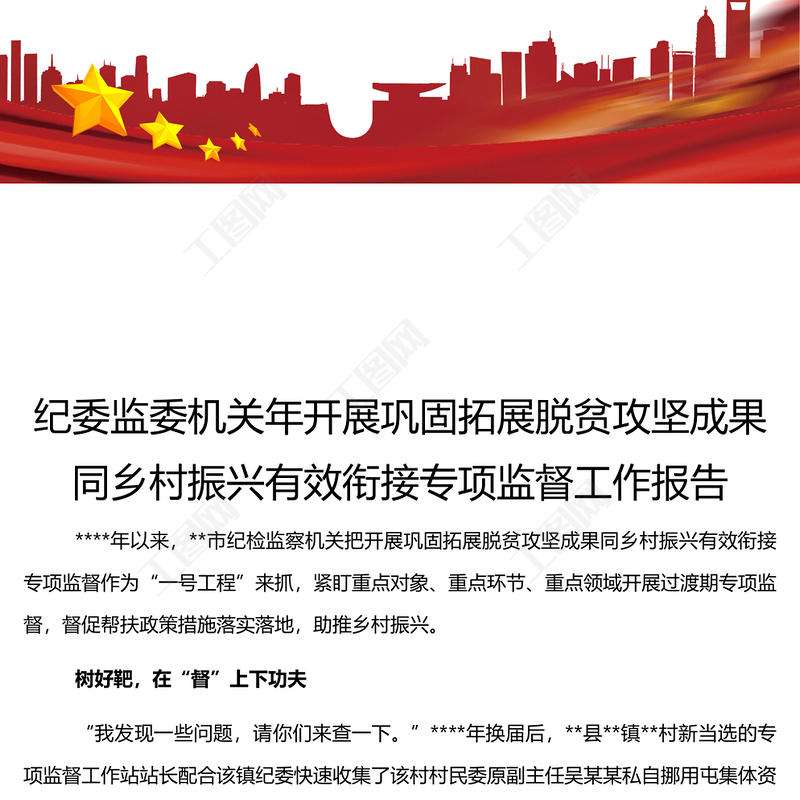 工圖網(wǎng)提供紀(jì)委監(jiān)委機(jī)關(guān)年開展鞏固拓展脫貧攻堅(jiān)成果同鄉(xiāng)村振興有效銜接專項(xiàng)監(jiān)督工作報(bào)告供會(huì)員免費(fèi)下載。更多精彩黨課PPT素材,盡在工圖網(wǎng)。