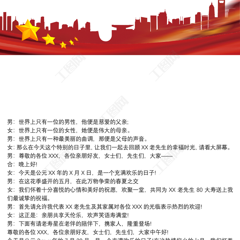 工圖網(wǎng)提供80大壽流程、主持詞及發(fā)言稿供會員免費下載。更多精彩黨課PPT素材,盡在工圖網(wǎng)。