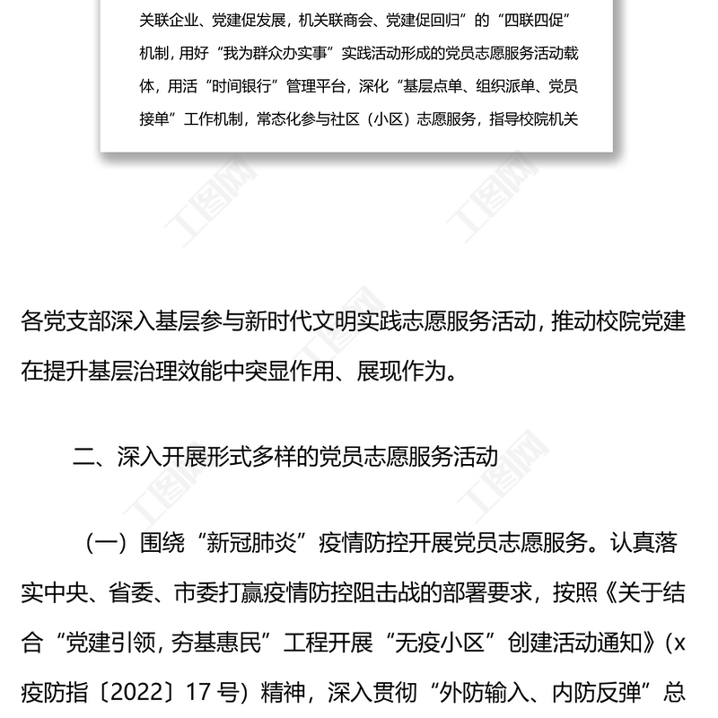 工圖網(wǎng)提供2022年校院黨員志愿服務(wù)活動(dòng)工作方案供會(huì)員免費(fèi)下載。更多精彩黨課PPT素材,盡在工圖網(wǎng)。