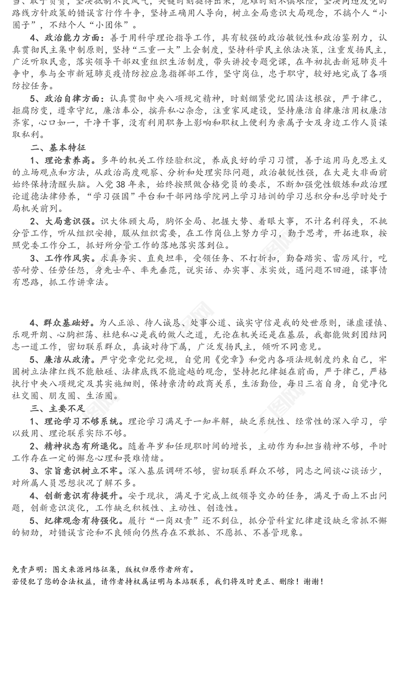 工圖網(wǎng)提供領(lǐng)導(dǎo)干部政治素質(zhì)考察個(gè)人自評(píng)材料供會(huì)員免費(fèi)下載。更多精彩黨課PPT素材,盡在工圖網(wǎng)。