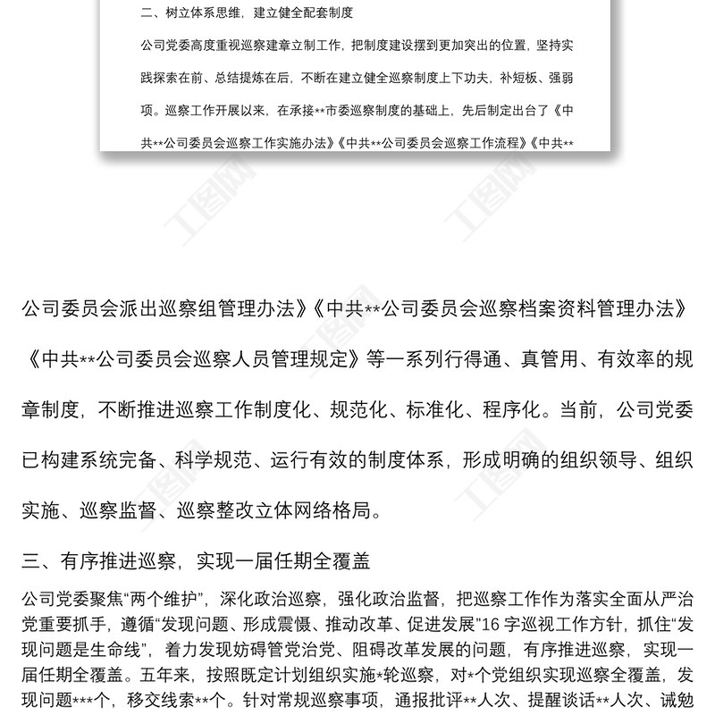 工圖網(wǎng)提供某國(guó)有企業(yè)黨委一屆任期巡察工作總結(jié)報(bào)告供會(huì)員免費(fèi)下載。更多精彩黨課PPT素材,盡在工圖網(wǎng)。