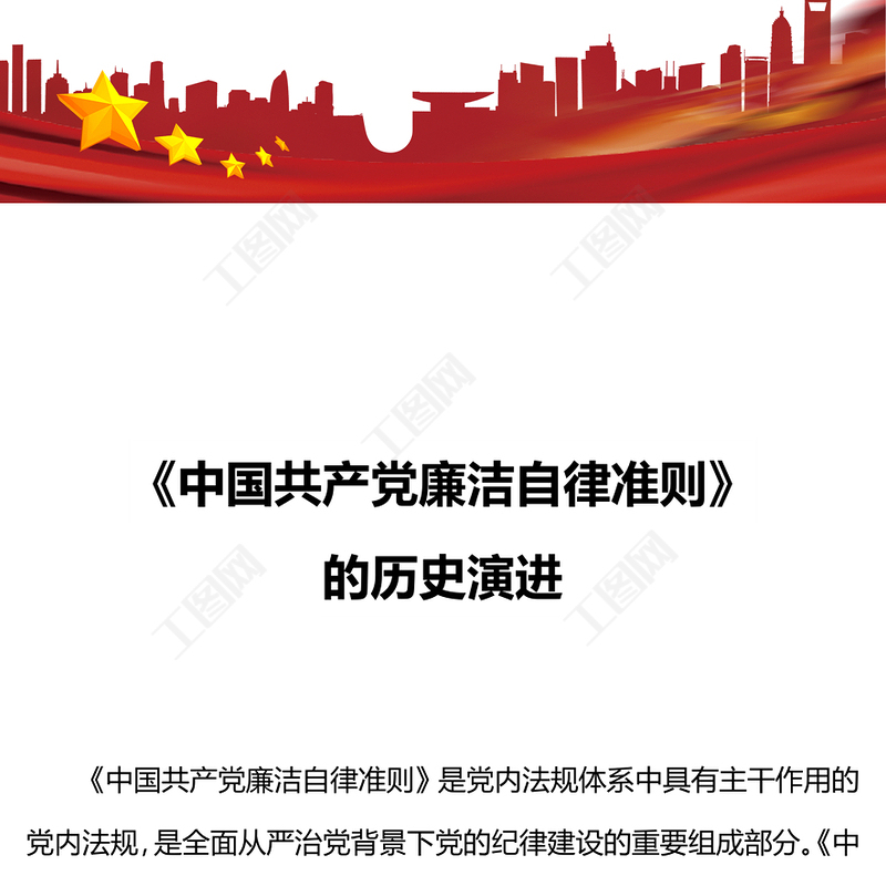 工圖網(wǎng)提供《中國共產(chǎn)黨廉潔自律準(zhǔn)則》的歷史演進黨課PPT課件(講稿)供會員免費下載。更多精彩黨課PPT素材,盡在工圖網(wǎng)。