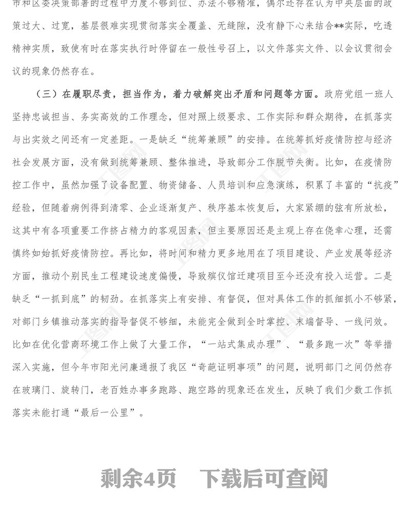 區(qū)人民政府黨組領(lǐng)導班子民主生活會對照檢查材料