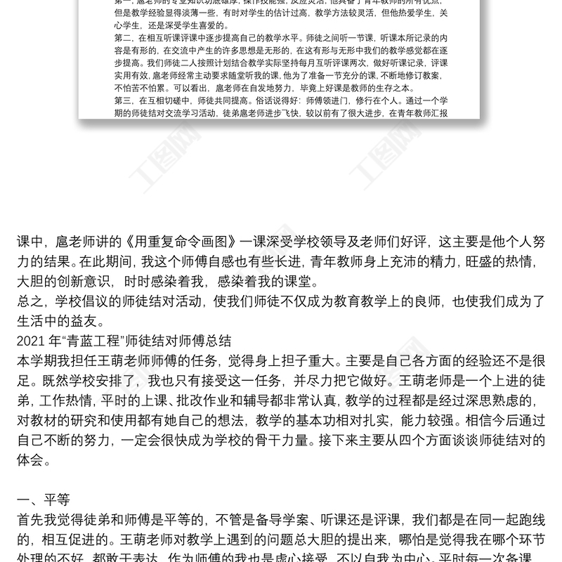 工圖網(wǎng)提供2021年“青藍(lán)工程”師徒結(jié)對(duì)師傅總結(jié)供會(huì)員免費(fèi)下載。更多精彩黨課PPT素材,盡在工圖網(wǎng)。