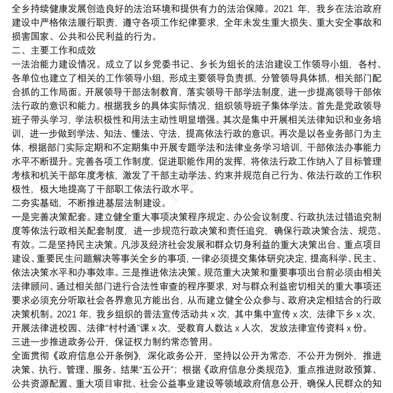 2021年度XX鄉(xiāng)法治政府建設(shè)情況工作報告