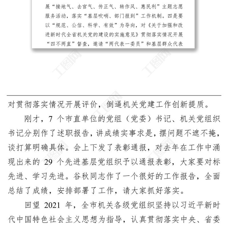 > 領(lǐng)導(dǎo)講話 > 【組織工作】在2022年全市機(jī)關(guān)黨的工作暨2021年市直機(jī)關(guān)黨建工作述職評議會議上的講話(20220318).DOCX 【圖片、文字、動畫均可編輯】
