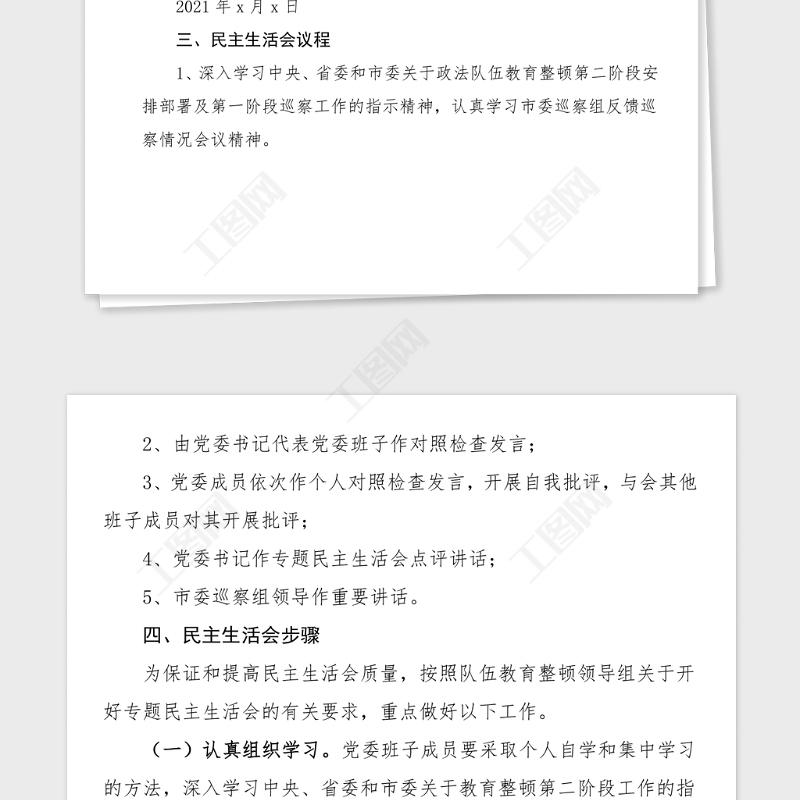 工圖網(wǎng)提供民主生活會(huì)方案2021年公安局政法隊(duì)伍教育整頓專題民主生活會(huì)實(shí)施方案范文工作方案供會(huì)員免費(fèi)下載。更多精彩黨課PPT素材,盡在工圖網(wǎng)。