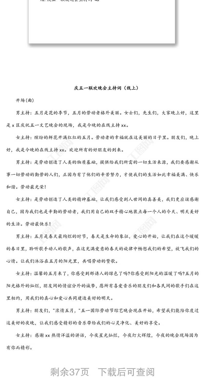 工圖網(wǎng)提供慶五一聯(lián)歡晚會(huì)主持詞匯編(12篇)供會(huì)員免費(fèi)下載。更多精彩黨課PPT素材,盡在工圖網(wǎng)。