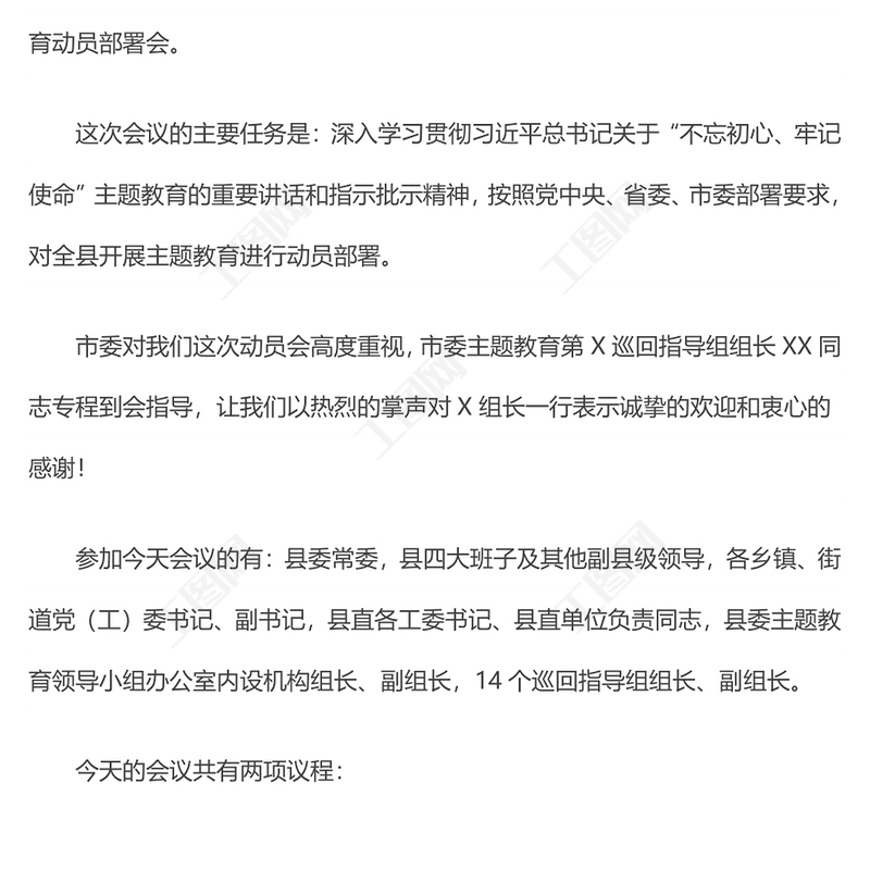 工圖網(wǎng)提供在第二批“不忘初心牢記使命”主題教育動員部署會上的主持詞動員會發(fā)言稿供會員免費下載。更多精彩黨課PPT素材,盡在工圖網(wǎng)。