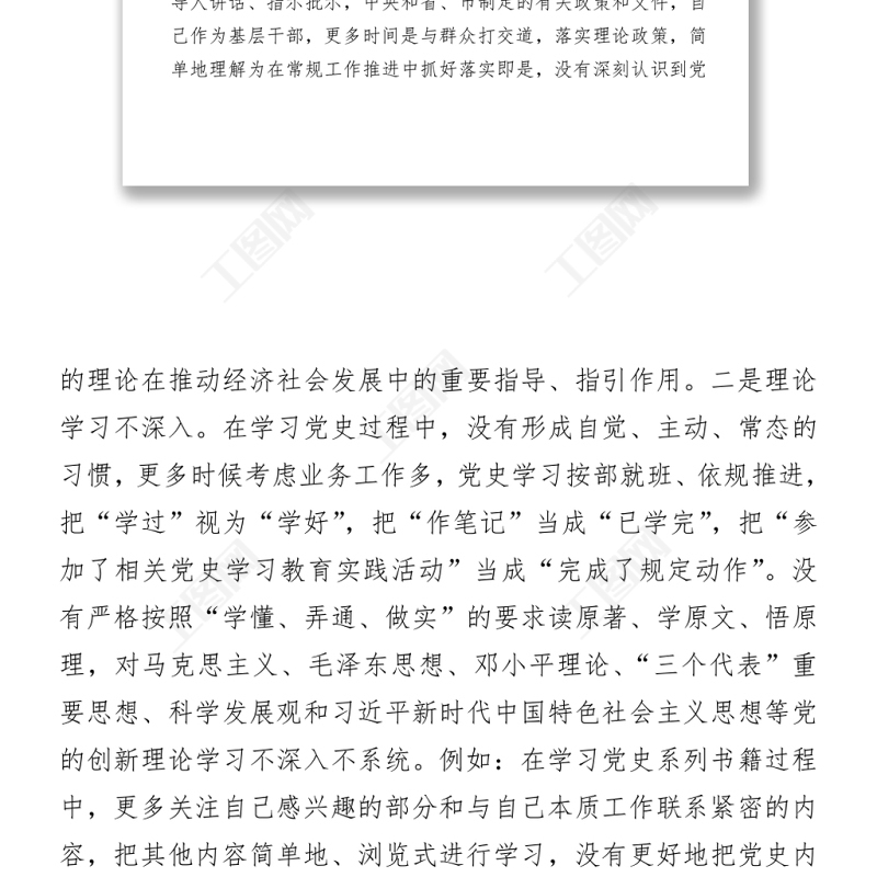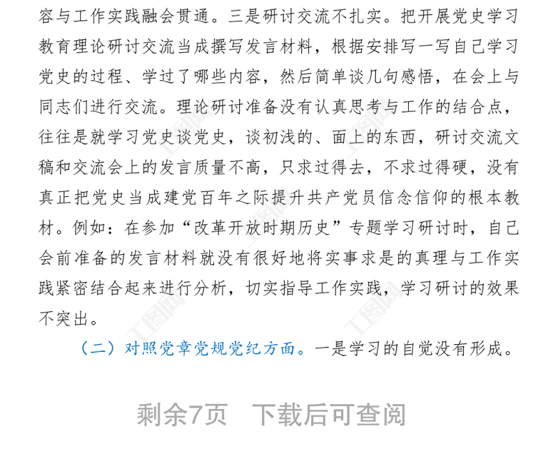 工圖網(wǎng)提供2021黨史學(xué)習(xí)教育專(zhuān)題民主生活會(huì)個(gè)人對(duì)照檢查材料供會(huì)員免費(fèi)下載。更多精彩黨課PPT素材,盡在工圖網(wǎng)。