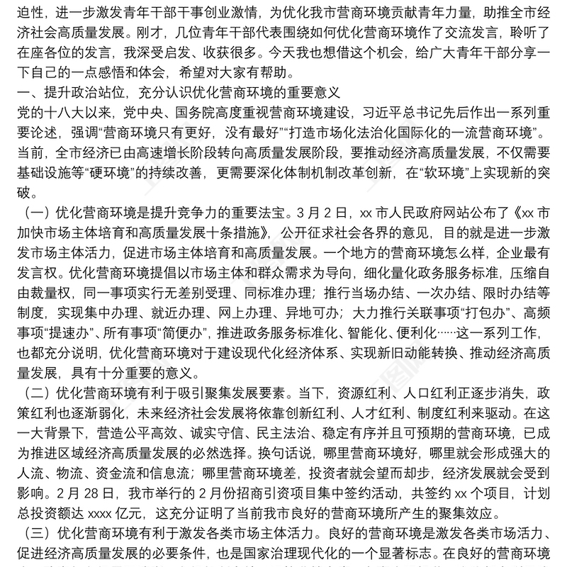 > 交流研討座談 > 凝聚青年奮進(jìn)力量 打造一流營商環(huán)境——市委領(lǐng)導(dǎo)在全市青年干部代表優(yōu)化營商環(huán)境座談會上的講話.DOCX 【圖片、文字、動畫均可編輯】