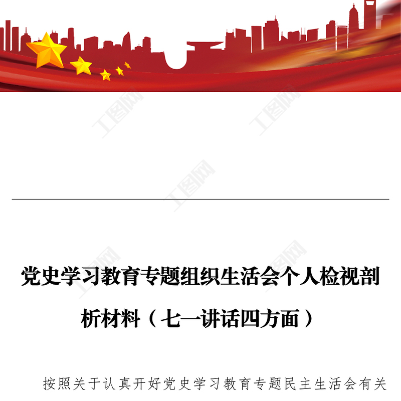 工圖網(wǎng)提供黨史學(xué)習(xí)教育專題組織生活會(huì)個(gè)人檢視剖析材料(七一講話四方面)供會(huì)員免費(fèi)下載。更多精彩黨課PPT素材,盡在工圖網(wǎng)。