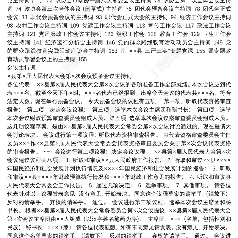 首頁 > WORD文檔 > 主持詞致辭 > 會議主持詞范文,各類會議50篇150頁.DOCX 【圖片、文字、動畫均可編輯】