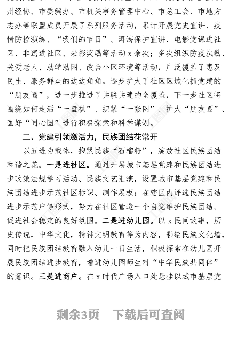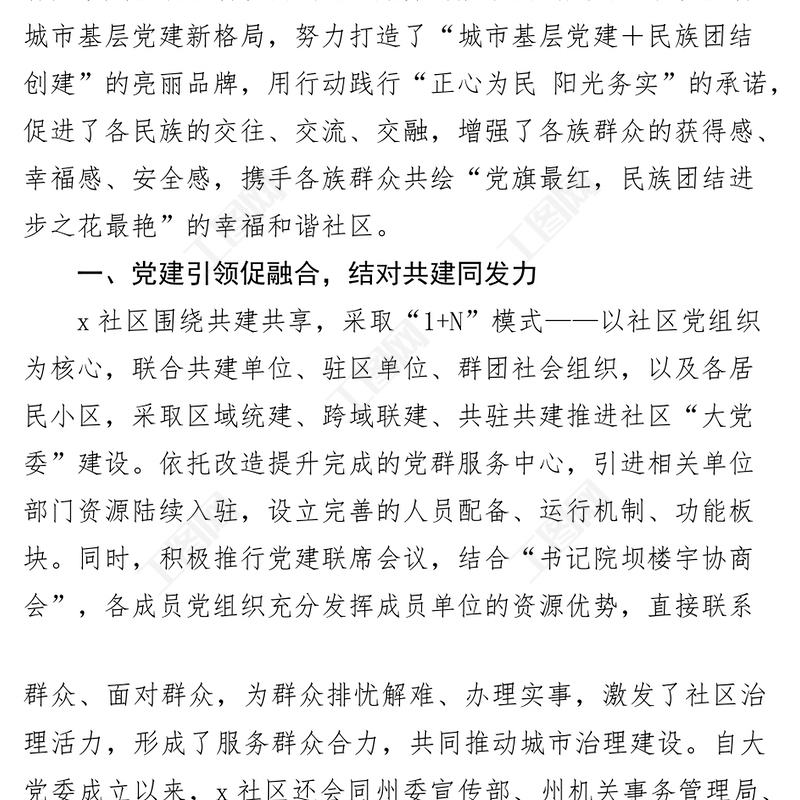 工圖網(wǎng)提供社區(qū)黨建引領(lǐng)民族團(tuán)結(jié)進(jìn)步工作經(jīng)驗(yàn)材料總結(jié)匯報(bào)事跡供會(huì)員免費(fèi)下載。更多精彩黨課PPT素材,盡在工圖網(wǎng)。