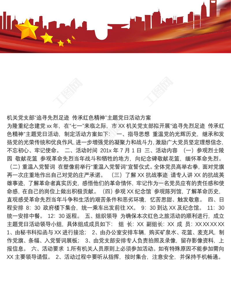 工圖網(wǎng)提供機(jī)關(guān)黨支部“追尋先烈足跡 傳承紅色精神”主題黨日活動(dòng)方案供會(huì)員免費(fèi)下載。更多精彩黨課PPT素材,盡在工圖網(wǎng)。