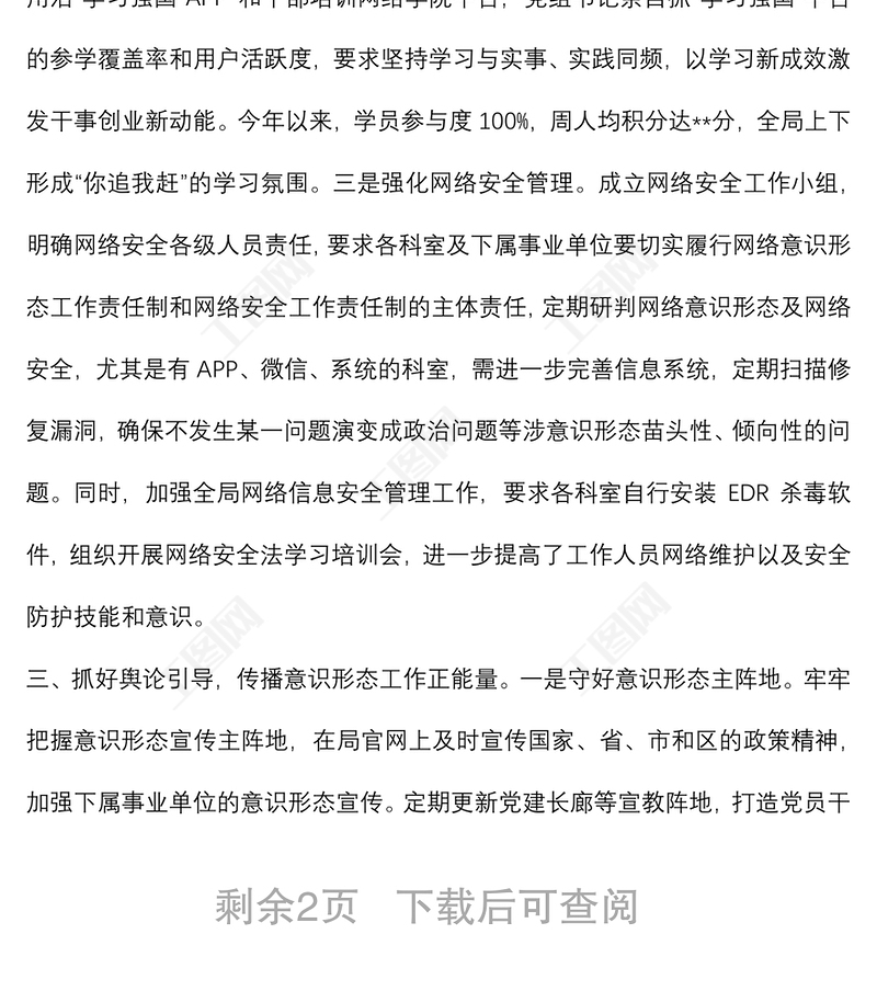 2021年意識(shí)形態(tài)工作學(xué)習(xí)材料2022意識(shí)形態(tài)工作研判報(bào)告意識(shí)形態(tài)工作調(diào)研報(bào)告2022年2022融媒體中心意識(shí)形態(tài)工作總結(jié)2022實(shí)驗(yàn)幼兒園意識(shí)形態(tài)工作責(zé)任清單2022黨支部年度意識(shí)形態(tài)工作報(bào)告2022意識(shí)形態(tài)工作巡察重點(diǎn)及注意事項(xiàng)中學(xué)2021年意識(shí)形態(tài)工作總結(jié)2022意識(shí)形態(tài)工作風(fēng)險(xiǎn)點(diǎn)排查方案2022意識(shí)形態(tài)工作措施不夠深入的原因2021年個(gè)人意識(shí)形態(tài)工作述職2022公安局意識(shí)形態(tài)工作講話稿2021車隊(duì)意識(shí)形態(tài)工作總結(jié)2022檢察人意識(shí)形態(tài)工作學(xué)習(xí)心得體會(huì)2022意識(shí)形態(tài)工作一會(huì)一報(bào)制度文件消防大隊(duì)2021年意識(shí)形態(tài)工作總結(jié)