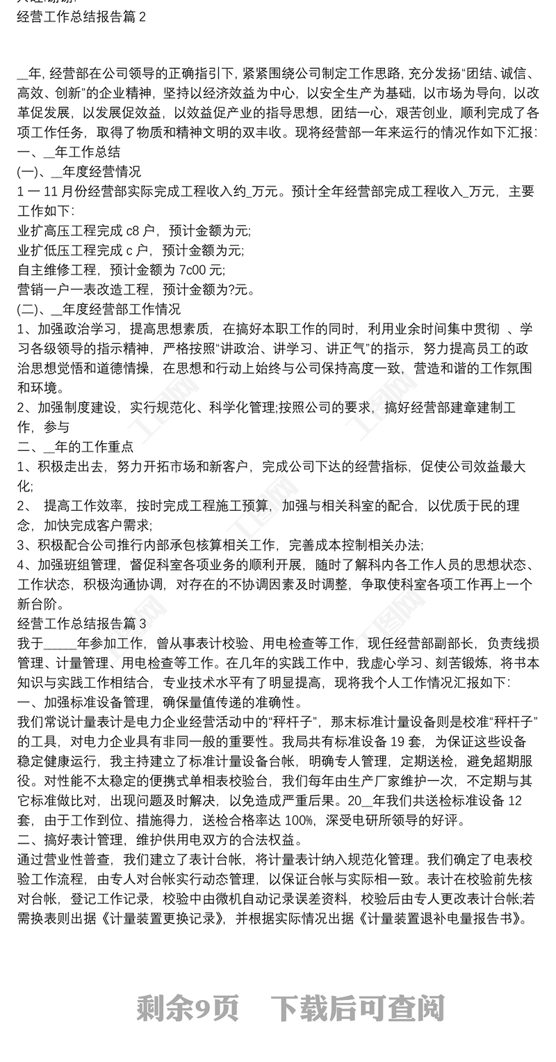 工圖網(wǎng)提供經(jīng)營(yíng)工作總結(jié)報(bào)告9篇供會(huì)員免費(fèi)下載。更多精彩黨課PPT素材,盡在工圖網(wǎng)。