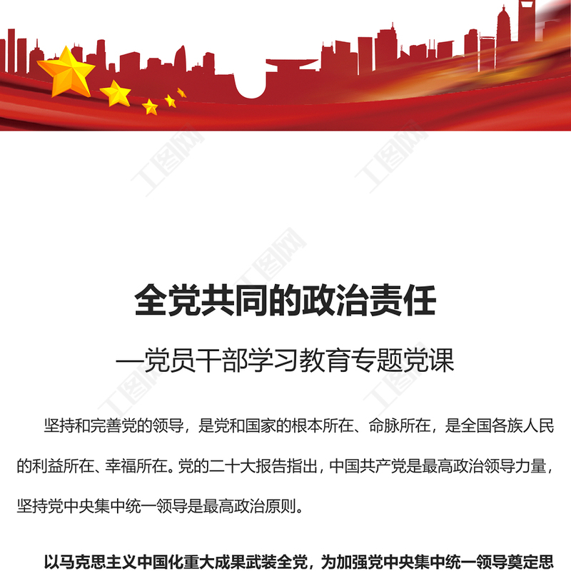 工圖網(wǎng)提供2022全黨共同的政治責任PPT紅色精美風黨員干部學習教育專題黨課黨建課件(講稿)供會員免費下載。更多精彩黨課PPT素材,盡在工圖網(wǎng)。