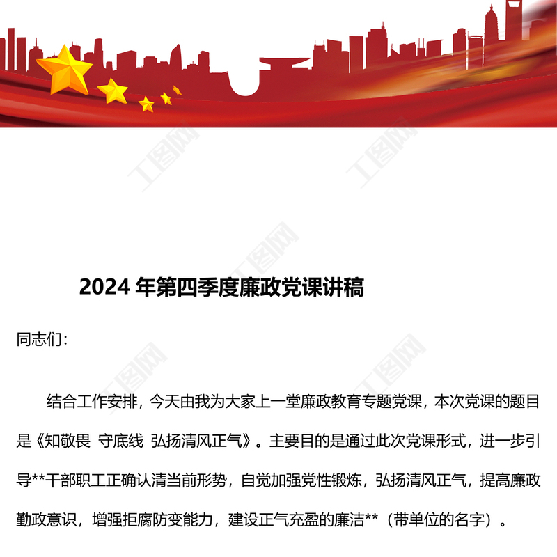 工圖網(wǎng)提供2024年第四季度廉政黨課稿子供會員免費下載。更多精彩黨課PPT素材,盡在工圖網(wǎng)。